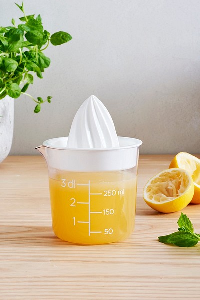 The GastroMax citrus press makes it easy to extract juice from lemons, limes and oranges. The spiral design on the top part makes juicing more efficient. The juicing container doubles as a measuring cup with clear volume markings and a spout that does not dribble. Made in Sweden, with 20 % renewable content (allocated via ISCC mass balance approach). Dishwasher-safe and heat-resistant up to 90 °C.